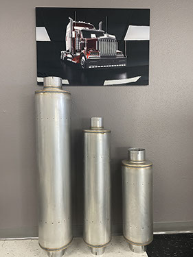 We carry a complete line of welded truck mufflers ranging from 6" to 10" diameters and ovals up to 10" x 15", diesel kits and large diameter stainless diesel tips.